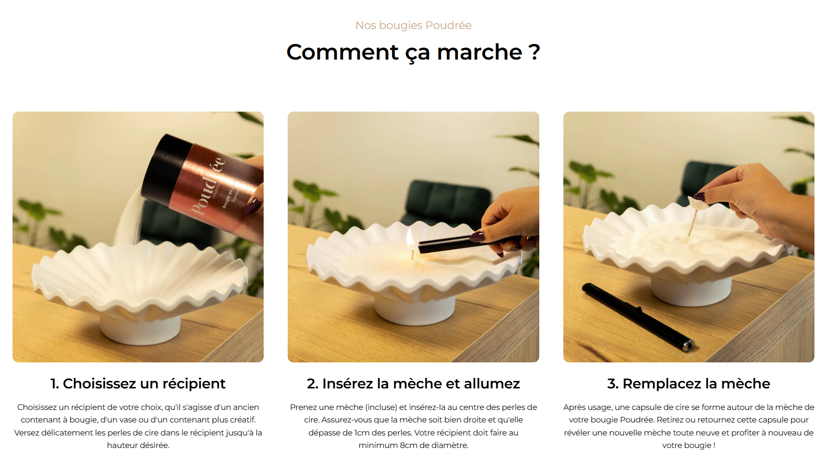 Imaginées par la marque française Poudrée Paris, ces perles de cire sont une invitation à la créativité et à la personnalisation. Elles offrent la liberté de renouveler vos bougies à l’infini, de sublimer vos contenants préférés ou d’offrir un cadeau original et raffiné.