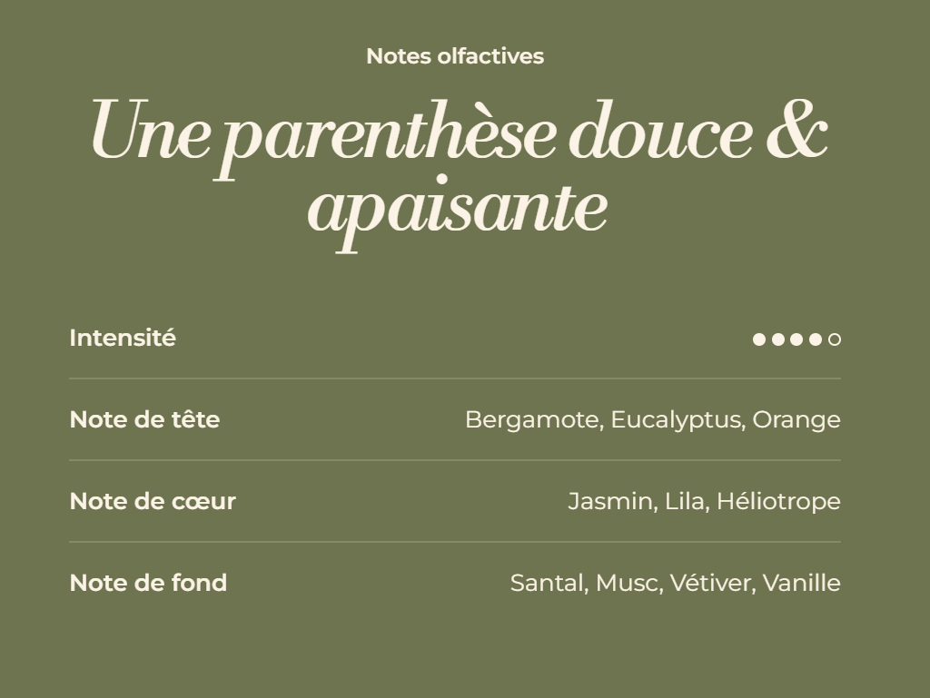 Comme une brise douce traversant une pièce baignée de lumière, la recharge Relax , ajoutée dans votre diffuseur, diffuse un parfum apaisant. Chaque note s’élève délicatement, invitant à la méditation et au calme intérieur, transformant votre diffuseur en un refuge sensoriel où sérénité et équilibre règnent en harmonie.